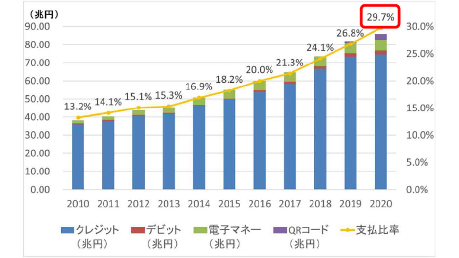 国内のキャッシュレス決済の比率は、この10年で倍増しました。しかし、2020年の国内のキャッシュレス決済比率は約3割で、世界水準の4~6割と比較すると差があります。そこで日本政府は、世界水準に近づけるべく2025年のキャッシュレス決済比率を4割まで伸ばすことを目標としました。